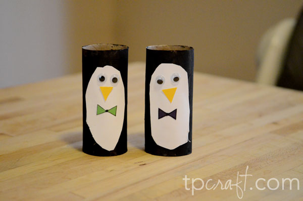 Start by painting your toilet paper roll black and allow to dry. Cut an oval out of your white paper. Add google eyes, beak, and a small bow tie.