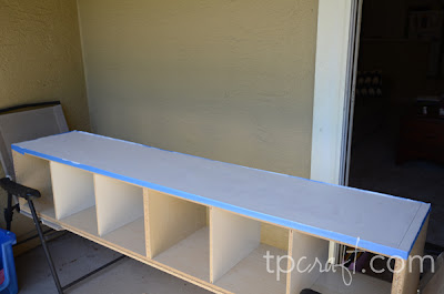 I began by flipping the bookshelf on its side and coating it with some primer. I also added 3 sets of casters to the bottom. I started with just 2 sets of casters but because it’s so long I added an additional set in the middle.