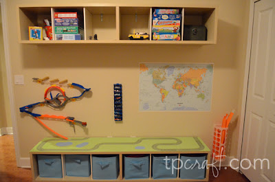 Here you can see it in the playroom. We mounted the other bookcase above train/car table for additional storage. The blue fabric bins were bought at Target and fit perfectly. You can see the Ikea hack for Hot Wheels track holder here.